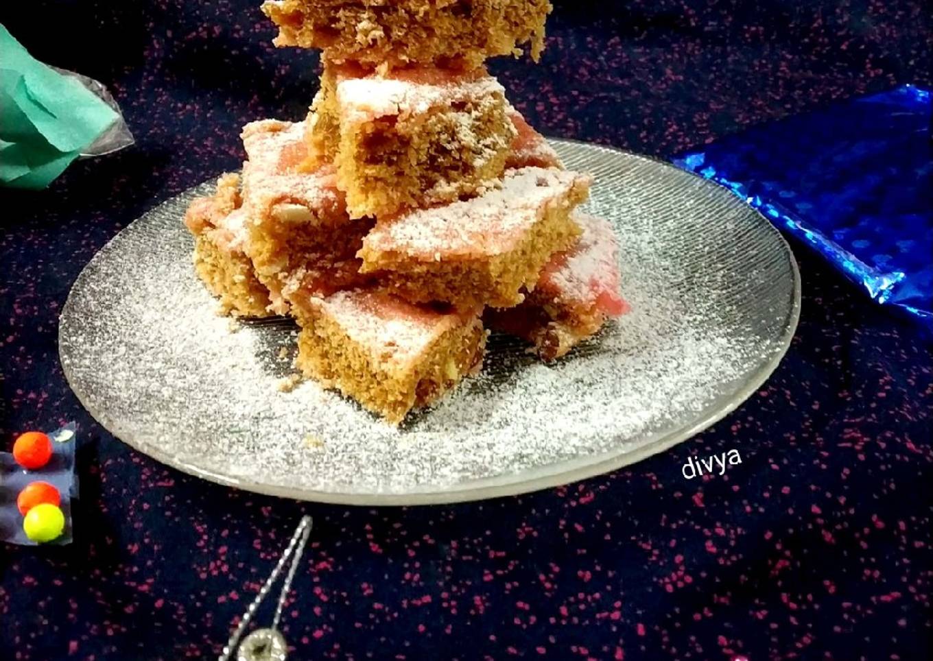 - Once it's perfectly baked leave room temperature for settle down then cut pieces sprinkle icing sugar ready to serve
