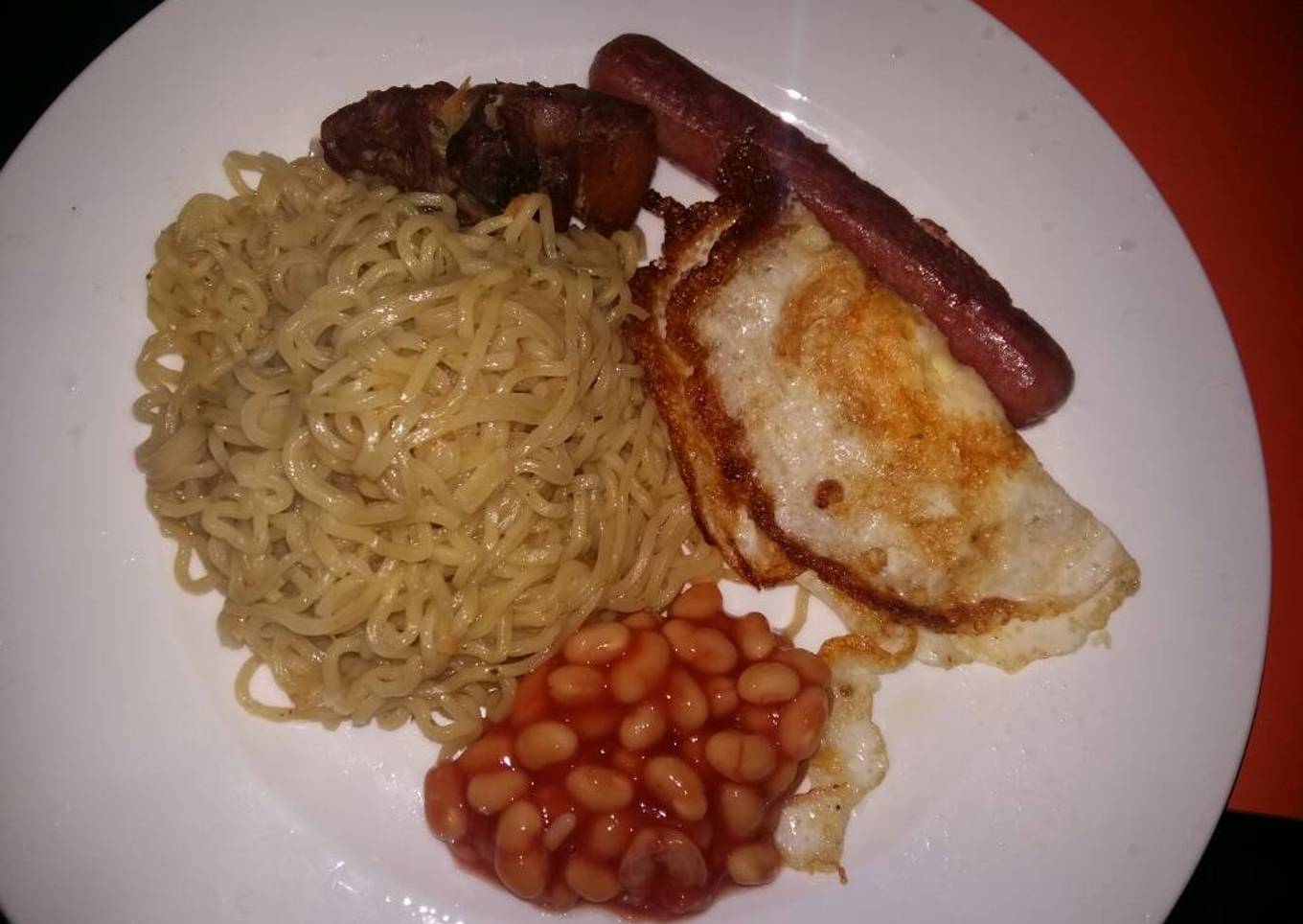 - Serve plan noodles with baked bean, eggs and sausages; since I had grilled chicken I decided to place it on the plate and enjoy my breakfast in peace