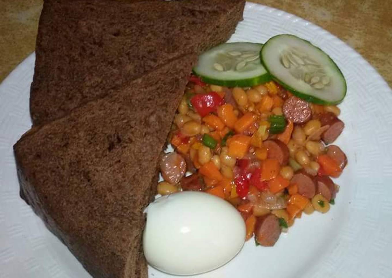 Chocolate bread with baked beans sauce, boiled egg & few slices of any veg of your choice
