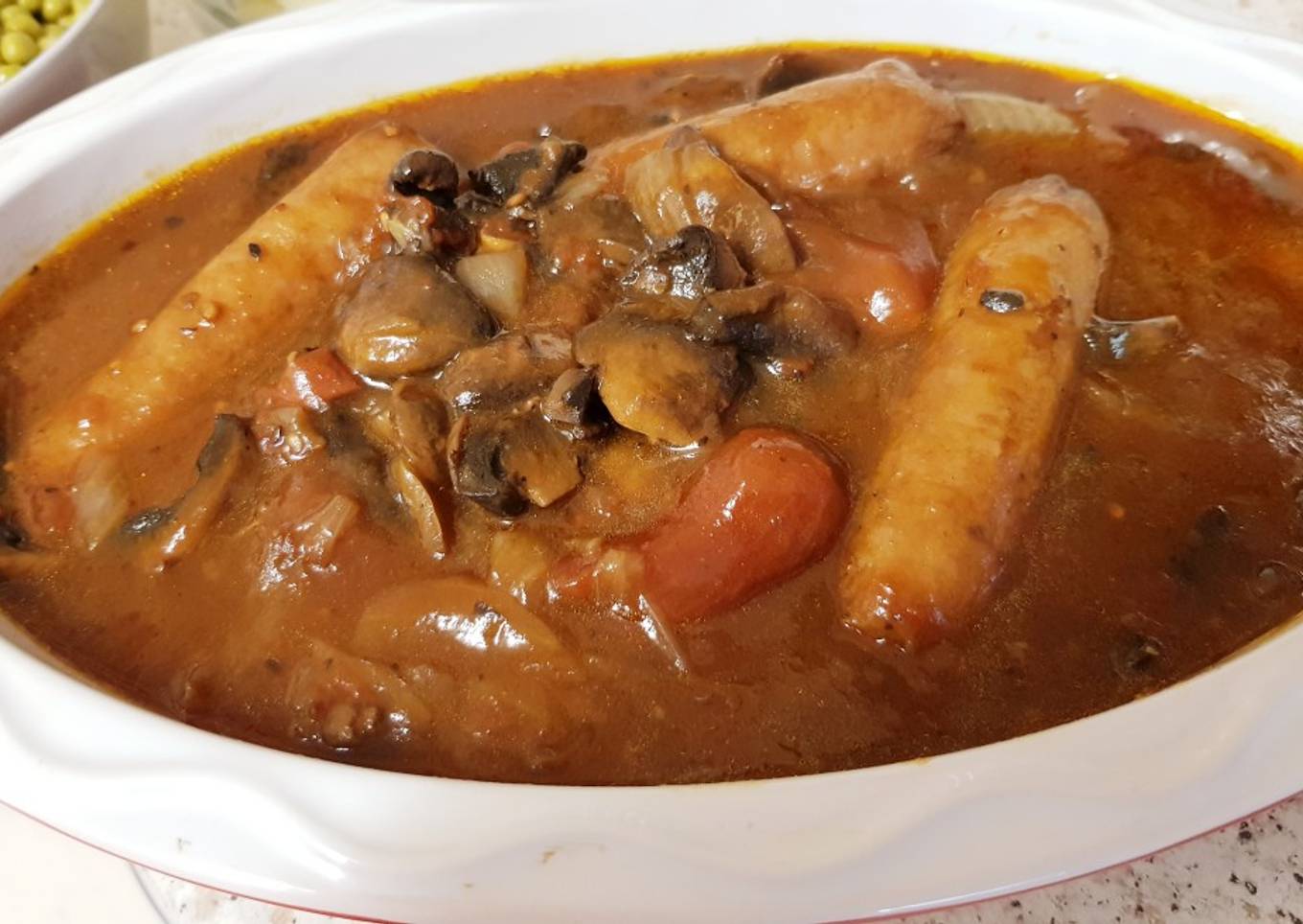 - Add the sausage to an oven proof dish and pour the mushroom mix all over the sausage.add a lid