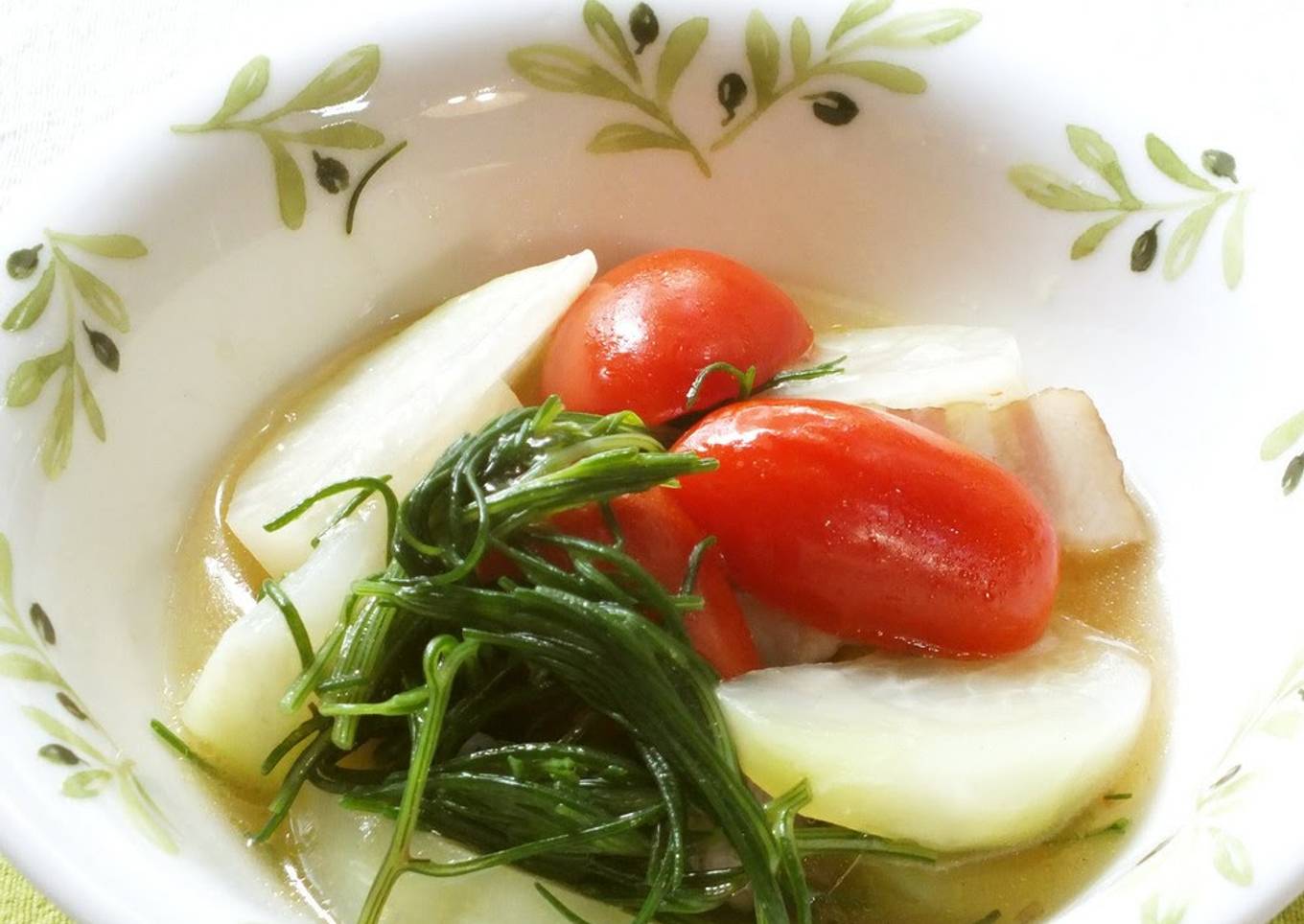 - When the kohlrabi becomes slightly tender, add the okahijiki and cherry tomatoes. Add salt if needed.